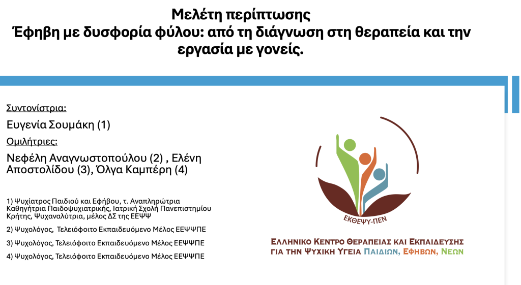 Το ΕΚΘΕΨΥ συμμετείχε στις εργασίες του 3ου συνεδρίου της ΕΕΨΨΠΕ, με τη διοργάνωση στρογγυλής τραπέζης με τίτλο «Η μελέτη περίπτωσης έφηβης με Δυσφορία Φύλου» με ομιλήτριες τις ψυχολόγους, κ. Νεφέλη Αναγνωστοπούλου, κ. Ελένη Αποστολίδου & κ. Όλγα Καμπέρη, υπό την προεδρεία και επίβλεψη της κ. Ευγενίας Σουμάκη, τ. Αναπληρώτριας Παιδοψυχιατρικής Παν. Κρήτης.